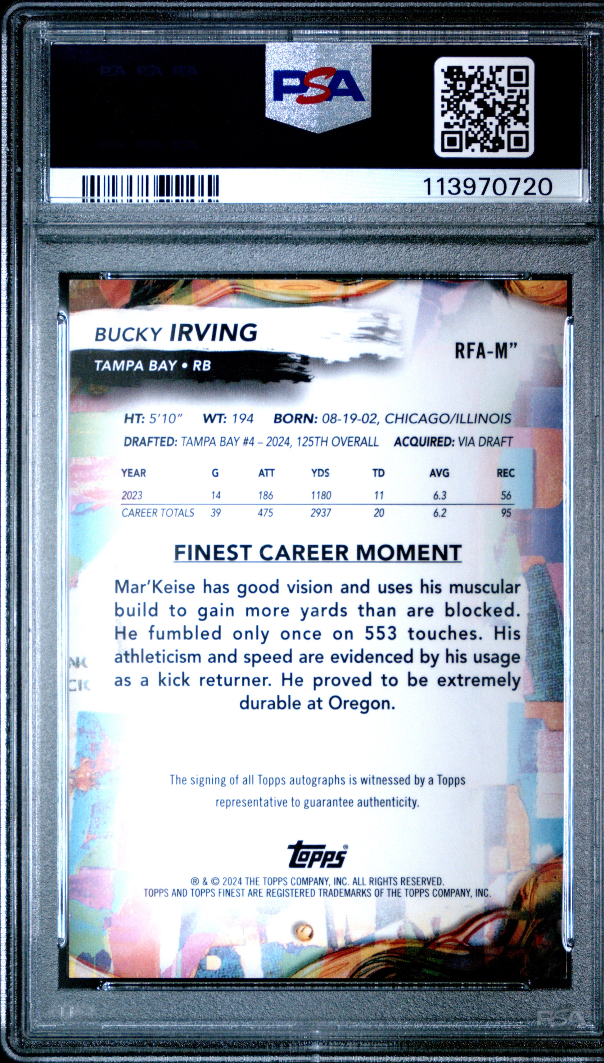 You are purchasing a 2024 Topps Finest Rookie Finest Autographs Bucky Irving #RFAM" RK Blue Chkbd 28/99 PSA. You will receive the exact item in the photographs. Thank you for looking. Listed With Mascot.